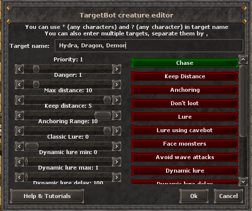 Ok, agora vamos destrinchar o que significa cada coisa nessa janela “TargetBot creature editor”.